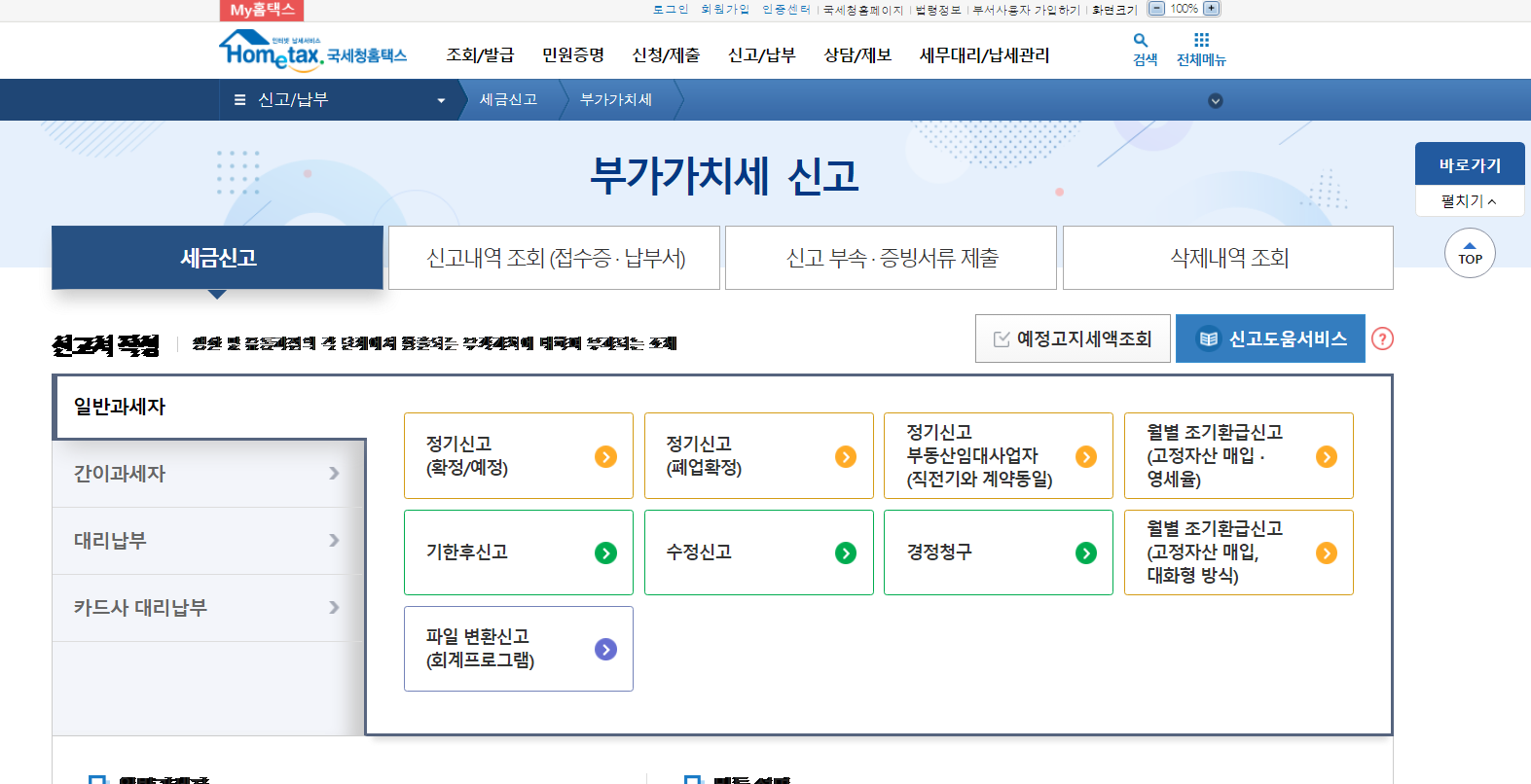 바로 보여지는 화면에서 일반과세자 정기신고를 누르시고 신고해주시면 되겠습니다.