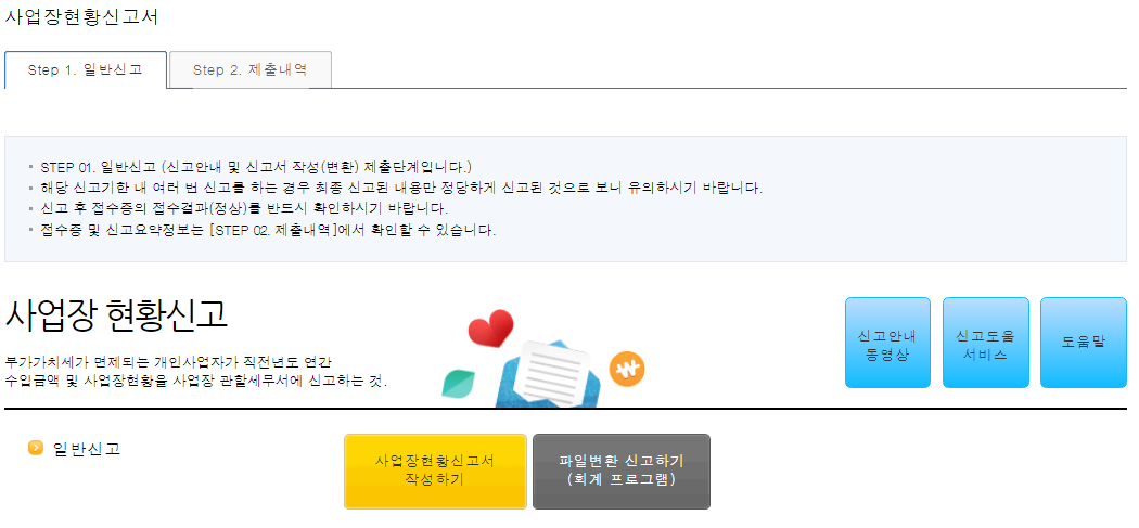 보여지는 화면에서 아래 노란색 사업장현황신고서 작성하기를 클릭해주세요.