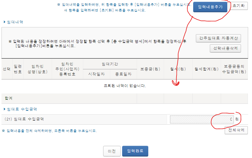 주소,임차인정보,임대정보 등 모두 입력해주셔야 합니다. 각각의 정보를 입력한 뒤 하단의 입력내용 추가를 누르게되면 임대내역 부분에 리스트가 생성되게 됩니다.