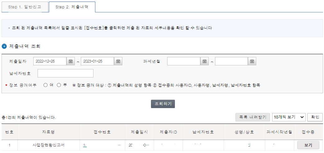 step1.일반신고 옆에 step2.제출내역을 누르시면 아래처럼 내 신고 내역을 바로 확인이 가능합니다.