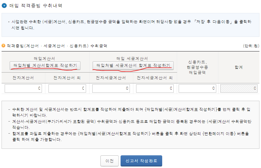 7. 수입내역 입력했고, 그러면 다음은 이제 사업을 위해 사용한 내역이 있다면 입력을 해야겠죠? 매입내역 입력하는 곳이 나옵니다. 각각 해당되는 내용들을 입력해주세요. 이를 입력하기 위해서는 영수증, 잘 모아놨어야 겠네요.