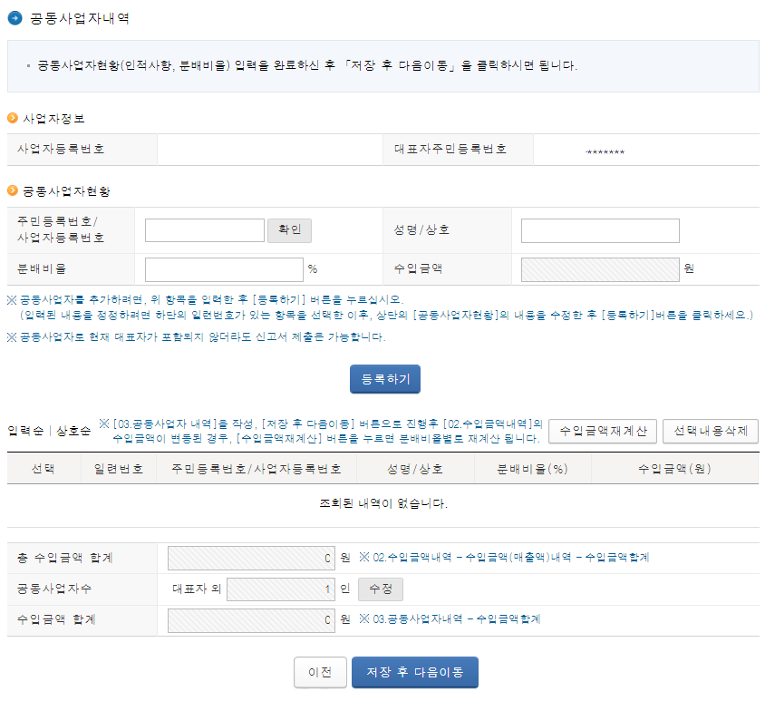 없다면 패스~~ 처음 기본정보 입력시 공동사업자 여부에서 부로 선택을 했다면 이 페이지는 나오지 않습니다.