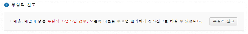 !! 여기서 만약 작년 1년동안 실적이 없다(매출 매입 모두 0원)면 하단의 무실적신고를 누르세요. 그러면 중간의 신고해야 하는 항목을 건너띄고 신고서 제출 페이지가 나오게 됩니다. 그럼 하단의 신고서 제출하기를 하면 바로 신고가 완료되게 됩니다. !!