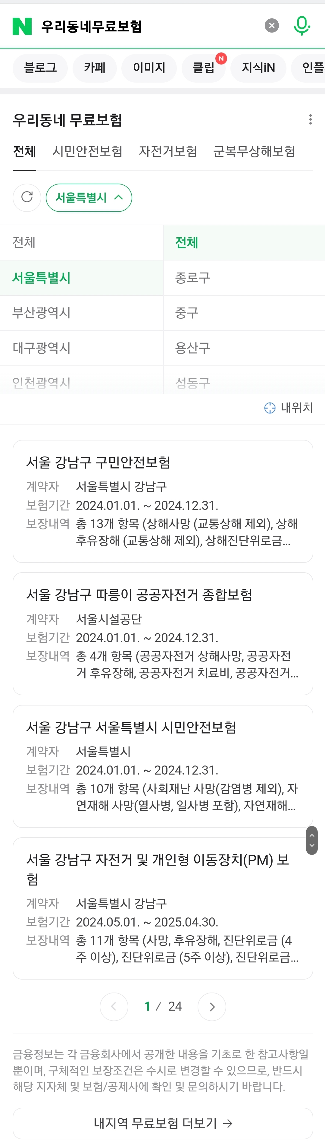 아래와 같이 네이버에서 검색하면 지역별로 보장해주는 내용이 나옵니다.