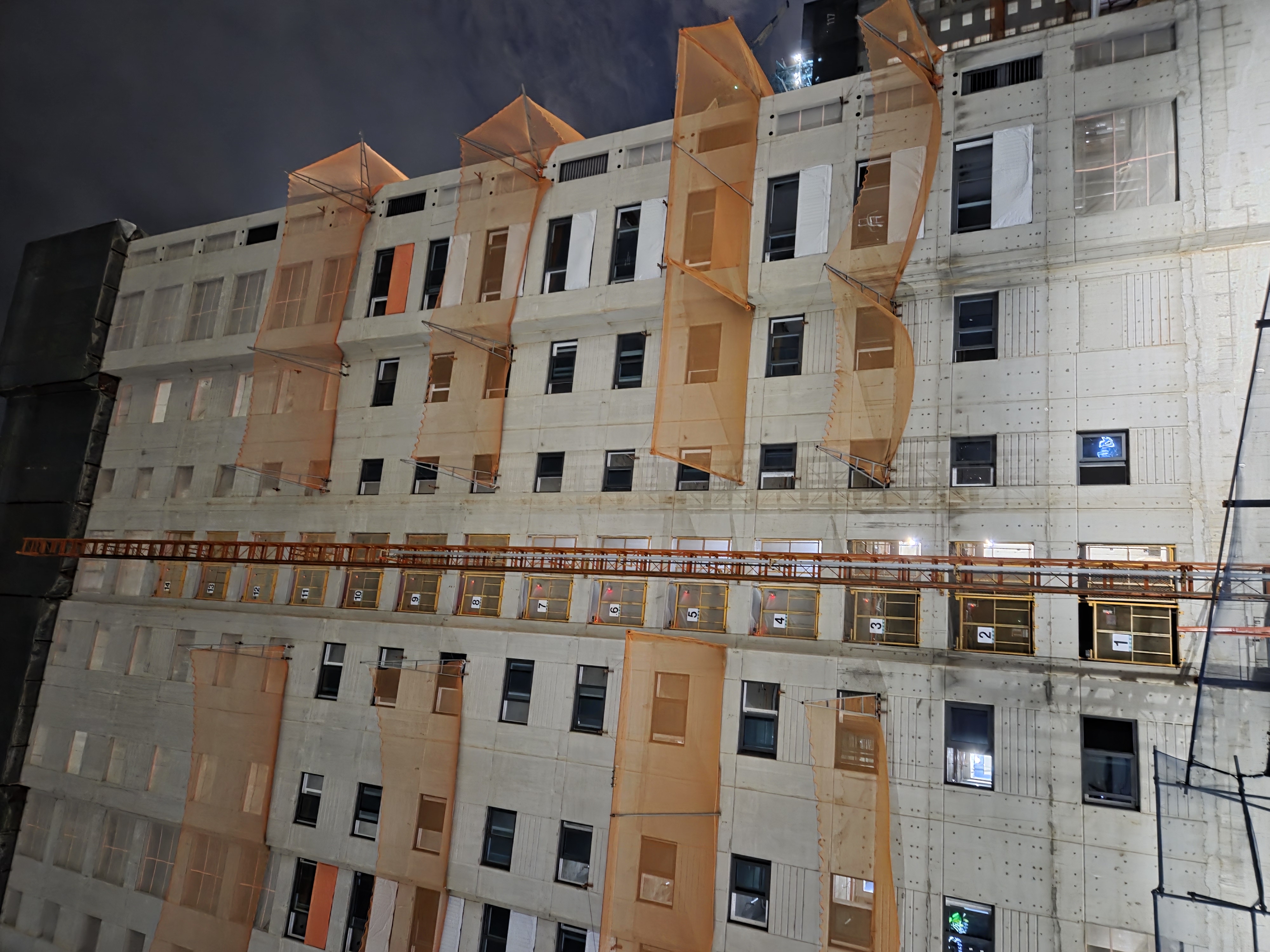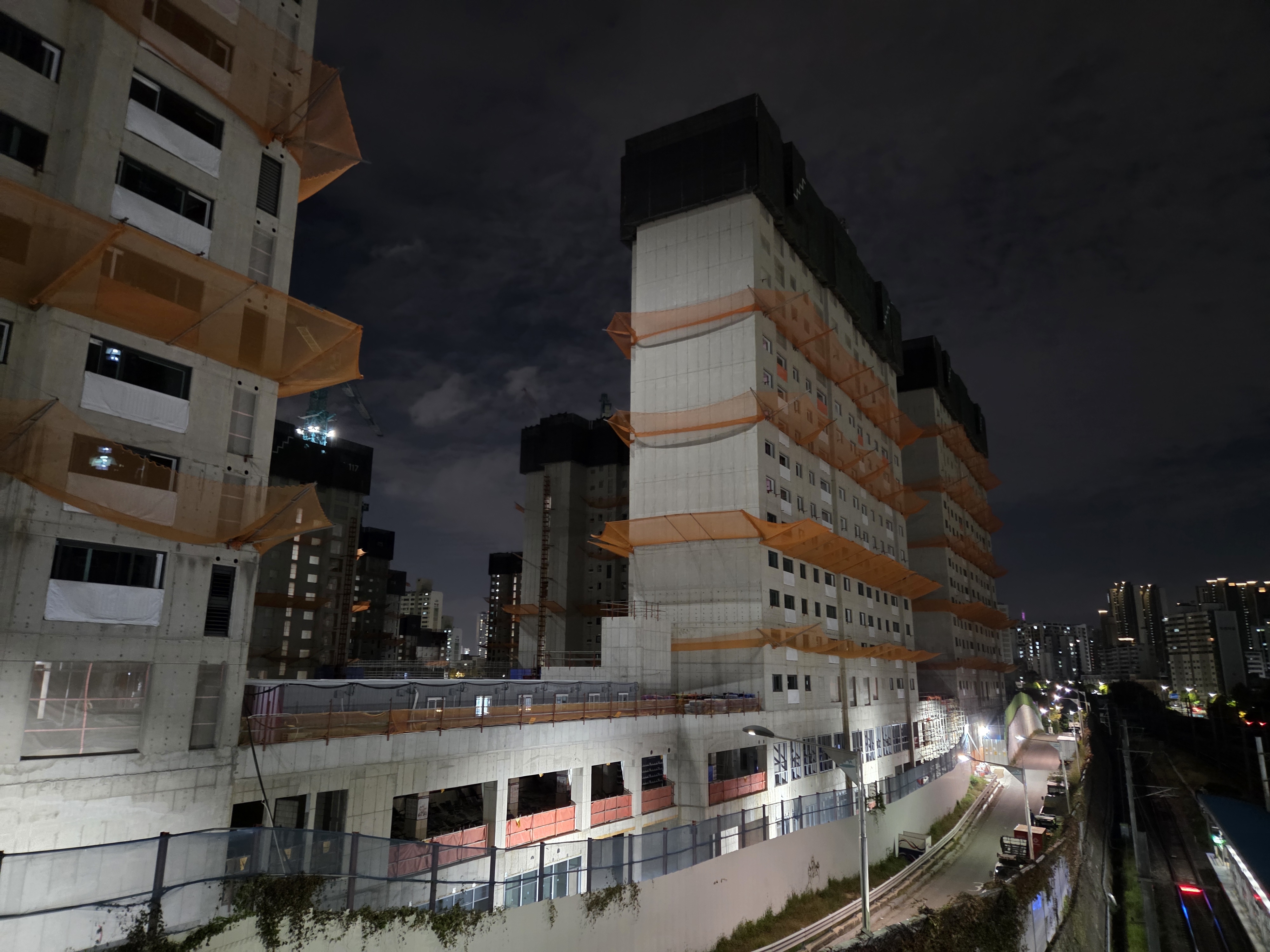 조명이 밝게 설치되어 있고, 일부 건물 내부에서는 야간 공사가 이뤄지고 있었습니다.