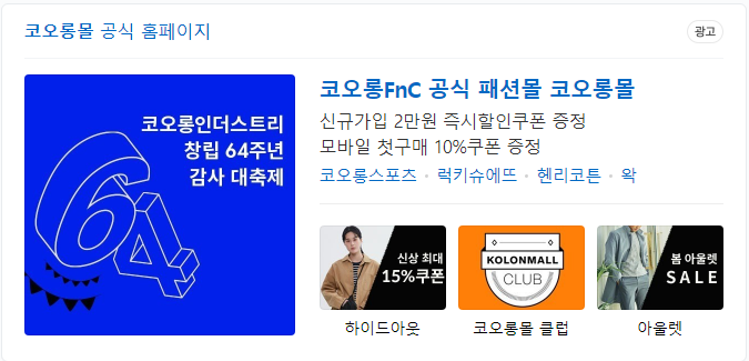 오랜만에 코오롱몰에 들어가려고 네이버에 검색하니 아래같이 세일중이라고 한다 ㅎㅎ